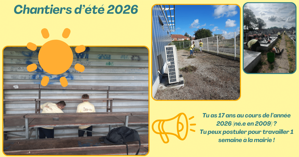 Si tu as 17 ans (né.e en 2009) au cours de l'année 2026, tu peux postuler aux chantiers d'été proposés par la mairie. Pour cela, tu dois déposer ta candidature avant le 30 avril 2026 en mairie : CV et lettre de motivation adressés à Monsieur le Maire.